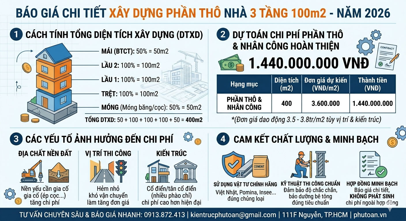 Chi Phí Xây Dựng Phần Thô Nhà 3 Tầng 100m2: Báo Giá Chi Tiết 2026